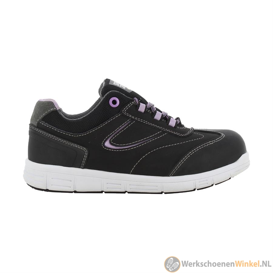 De Rihanna dames werkschoenen is een hele hippe en sportieve werkschoen in laag model. Een veiligheidsschoen waarmee u gezien mag worden. Qua uiterlijk valt het niet op dat het om een veiligheidsschoen gaat. Deze dames werkschoen is uitgevoerd in zwart met paarse afwerking en heeft een witte zool. De schoen heeft drie rijen veterlussen en één rij veterogen.