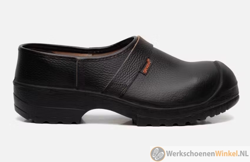 De Gevavi 1230 SB klomp heeft een zwarte rundlederen schacht en een slijtvaste PU-loopzool met antizwiknokjes voor extra stabiliteit. De aangespoten PU-kruipneus loopt vloeiend over in het design en biedt extra bescherming bij werkzaamheden waarbij u regelmatig knielt. Op de wreef bevindt zich een leren band met Gevavi-logo, wat de klomp een verzorgde, professionele uitstraling geeft.